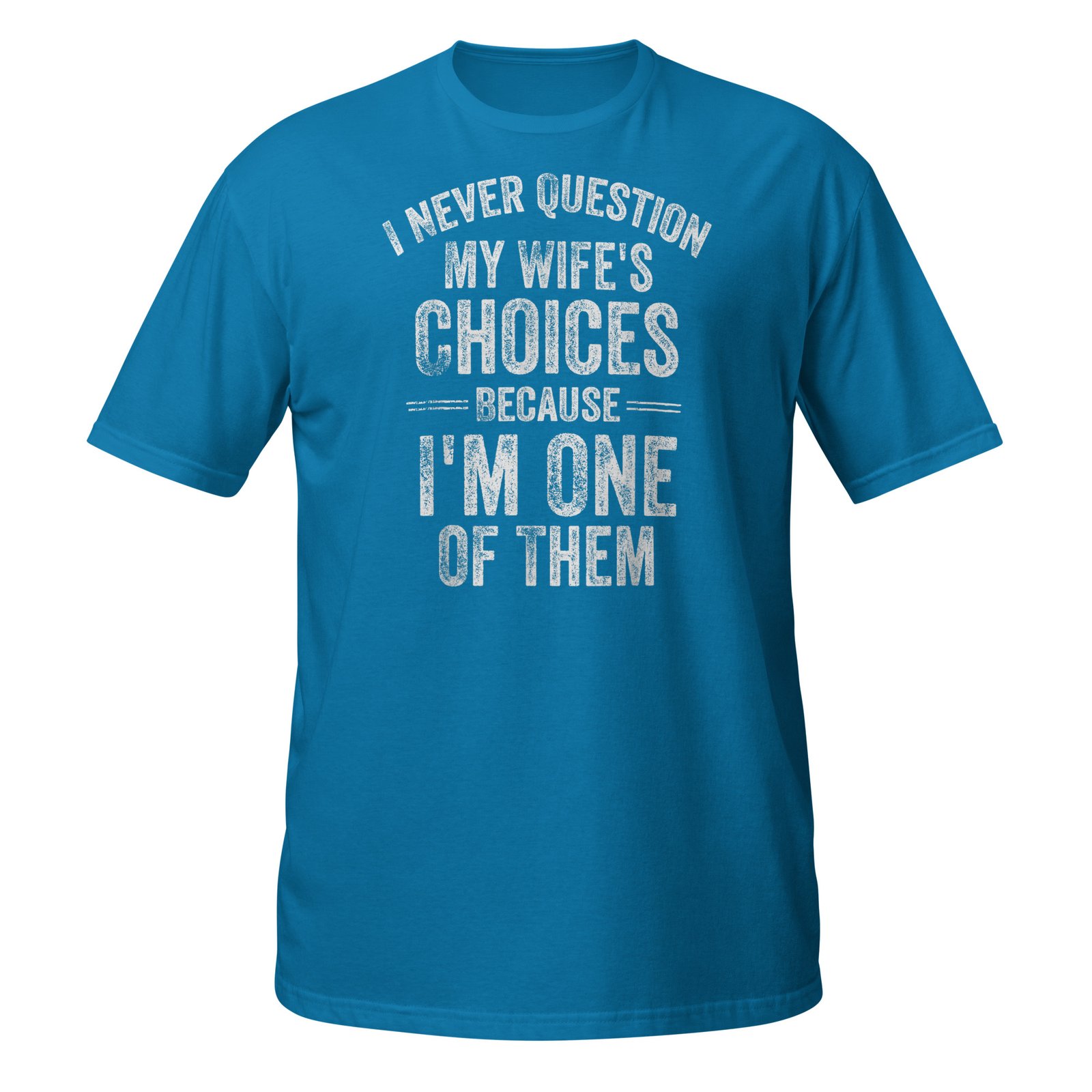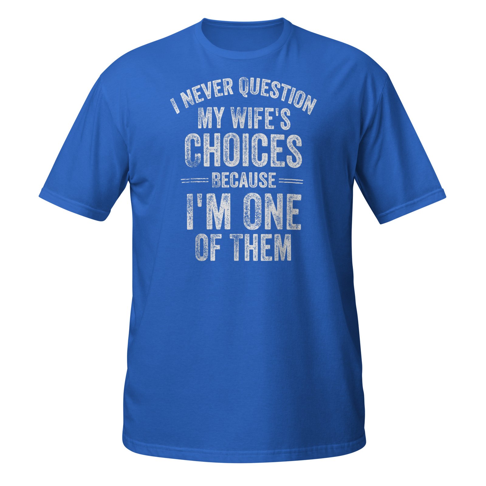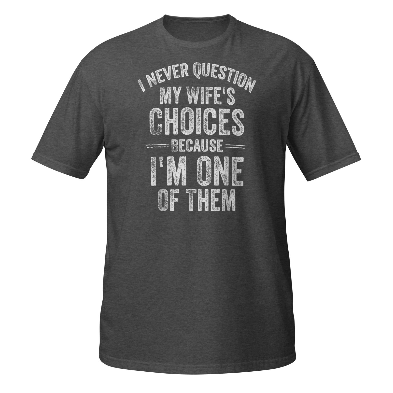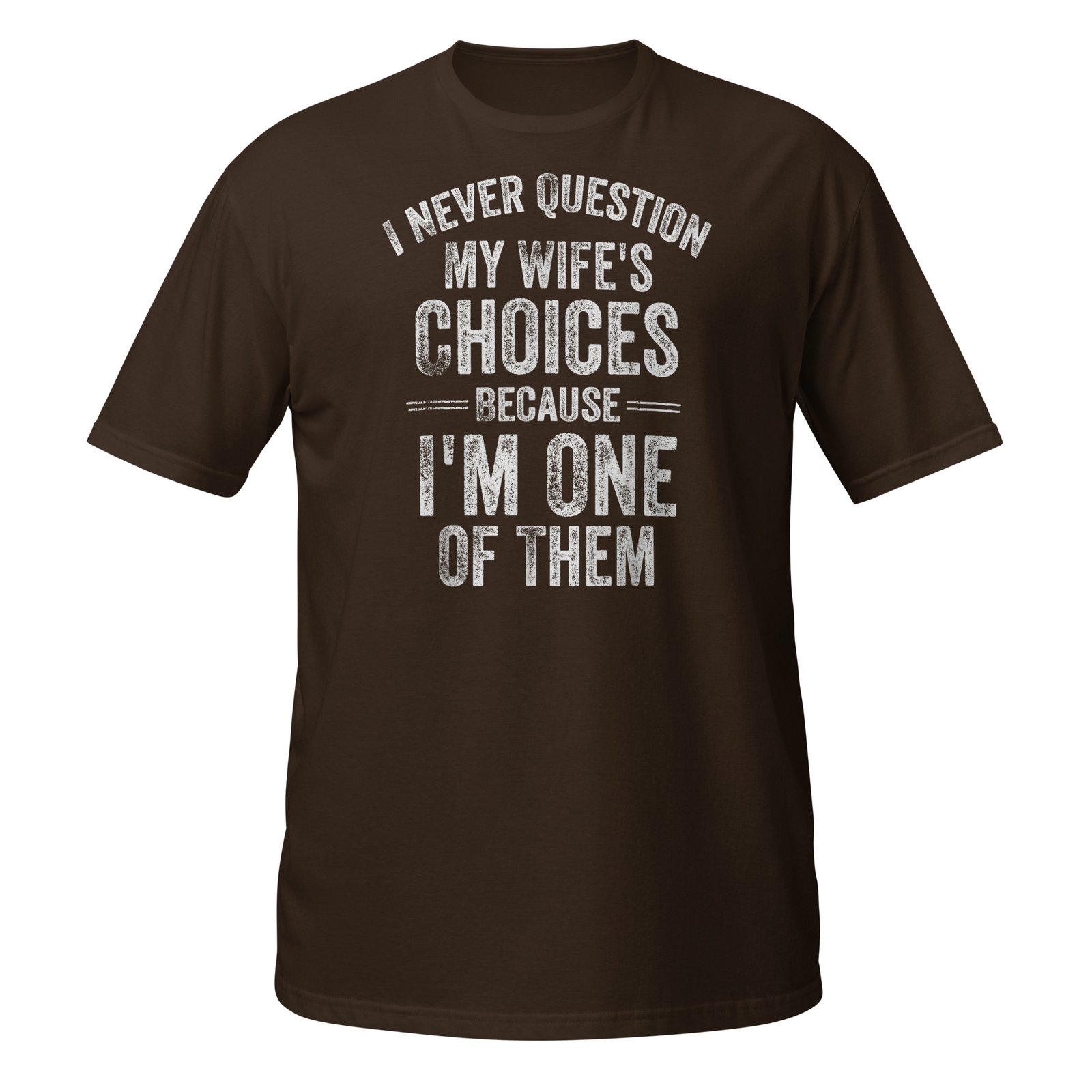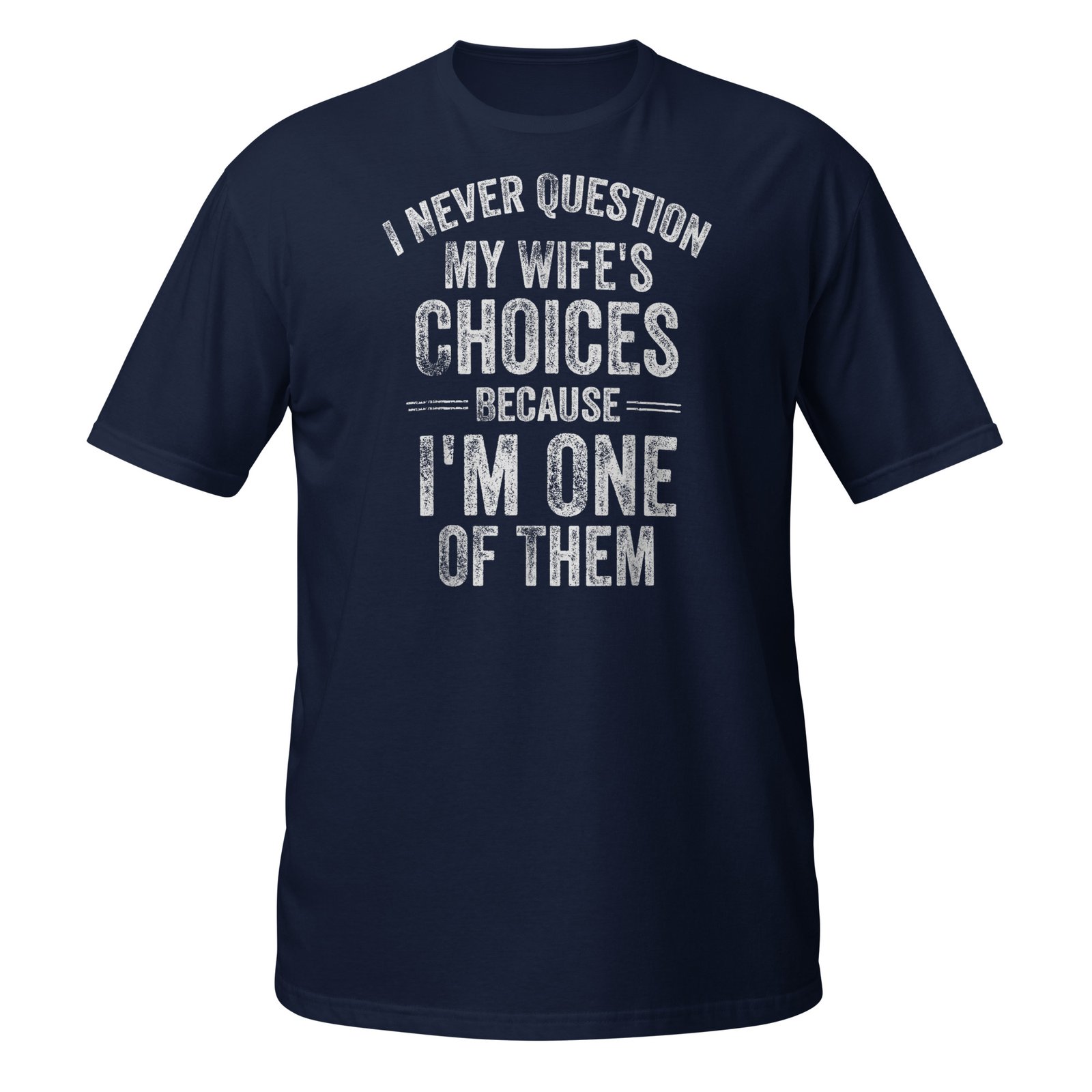 I Never Question My Wife’s Choices Because I’m One Of Them – bold distressed white text with playful marriage humor. Funny husband gifts for men who proudly admit they’re their wife’s best decision.